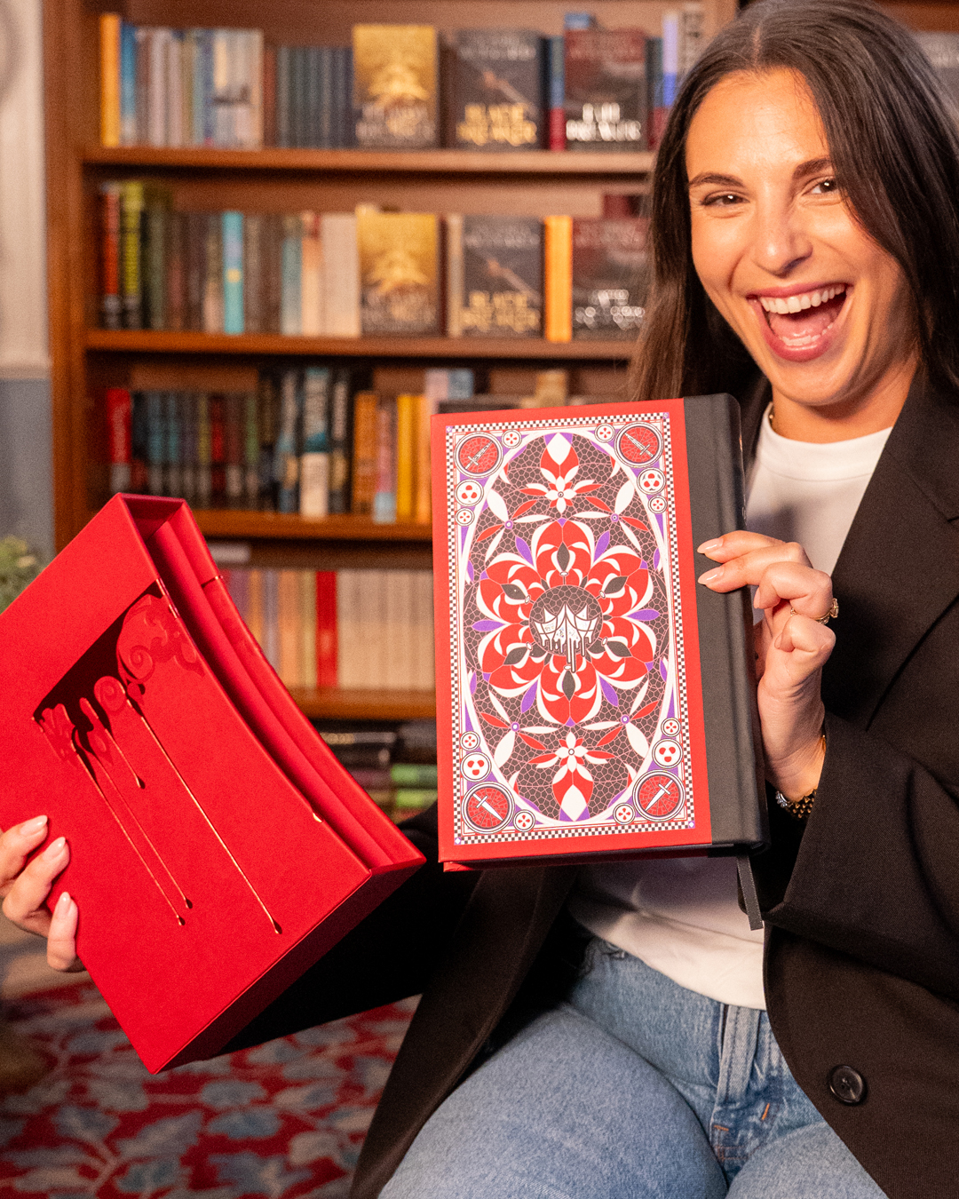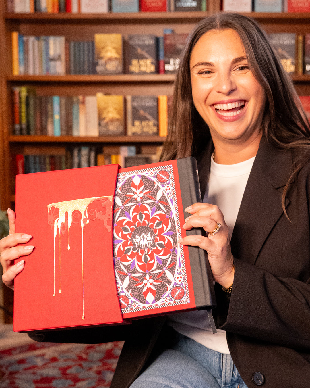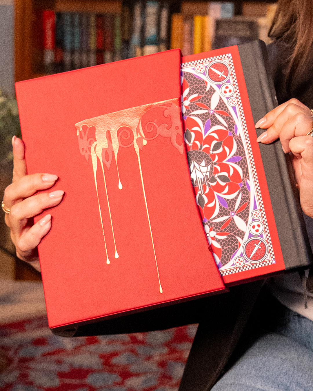 This limited 10th anniversary signed edition of Red Queen by Victoria Aveyard is bound in real cloth with faux leather quarterbinding, features a foiled stained-glass cover design, seven full colour internal illustrations and three gemstones inset into the spine of the book. Additionally, this edition is housed in a faux leather slipcase with a blind-debossed and foiled design that nods its head to the original book covers. This really is the ultimate edition of the book that kicked off the internationally bestselling fantasy series.